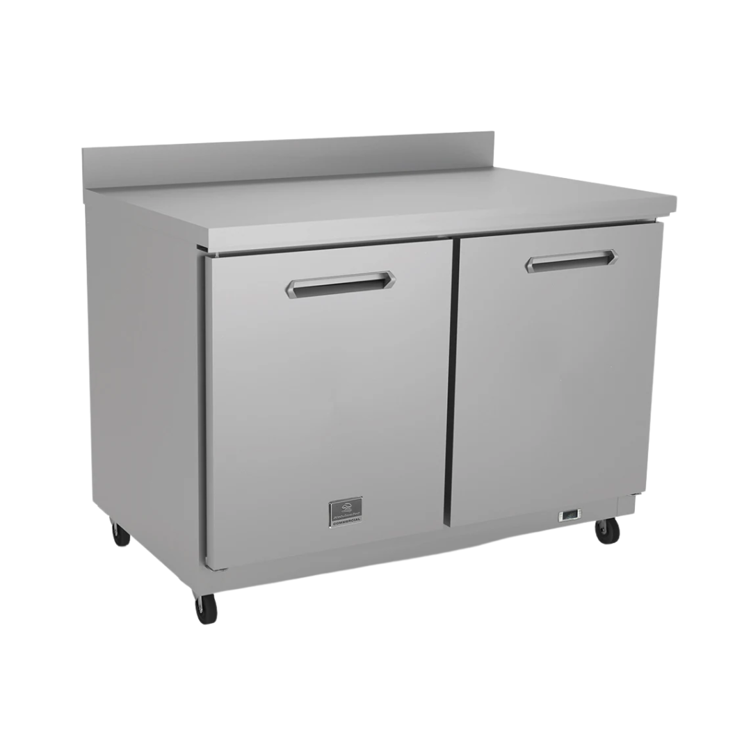The Kelvinator Commercial KCHUCWT48F is a two-door undercounter worktop freezer designed for demanding commercial kitchens requiring reliable, efficient frozen storage and workspace. This unit features durable stainless steel construction with a spacious stainless steel worktop, providing a robust prep surface. A practical backsplash prevents liquid spills from running down the back, helping maintain a clean and hygienic environment.