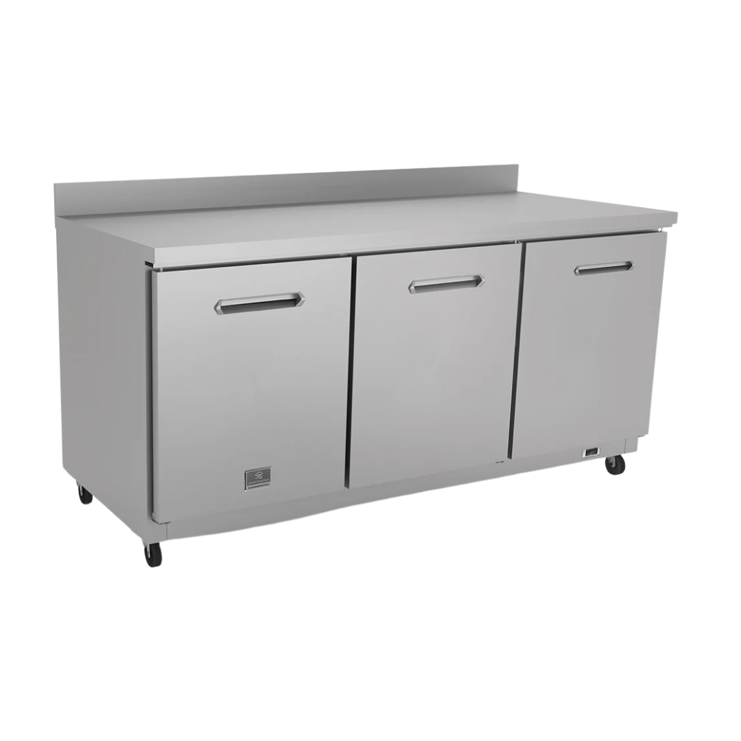 Kelvinator KCHUCWT72R 72" 3-Door Worktop Refrigerator is a high-performance undercounter reach-in refrigerator designed for commercial kitchens that demand both durability and convenience. This 72-inch wide, three-section unit features a sturdy 430 stainless steel worktop with a built-in backsplash, making it ideal for food prep while saving valuable kitchen space. Each of the three solid hinged doors opens to reveal a vinyl-coated steel shelf, providing organized and hygienic storage.