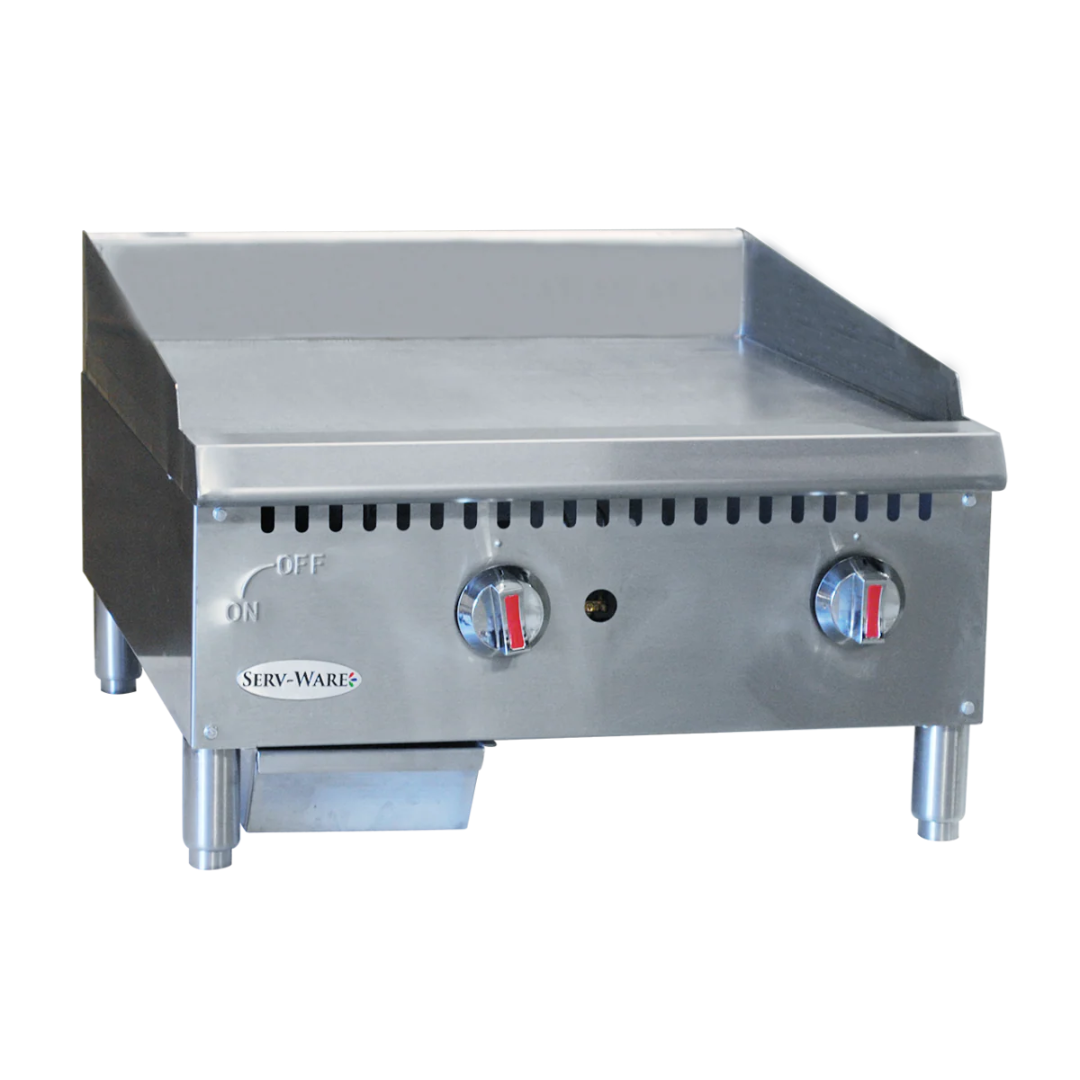 The Serv-Ware STGS-24 Thermostatic Gas Griddle is the perfect solution for foodservice establishments looking for professional-grade cooking performance in a compact footprint. Designed for maximum efficiency in small kitchens, this 24-inch countertop griddle features two 30,000 BTU cast iron H-shape burners, delivering a total of 60,000 BTUs across a ¾-inch thick smooth steel griddle plate. This high-performance design provides superior heat retention, fast recovery times, and even cooking across the entire surface—ideal for cooking eggs, bacon, pancakes, burgers, and grilled sandwiches.