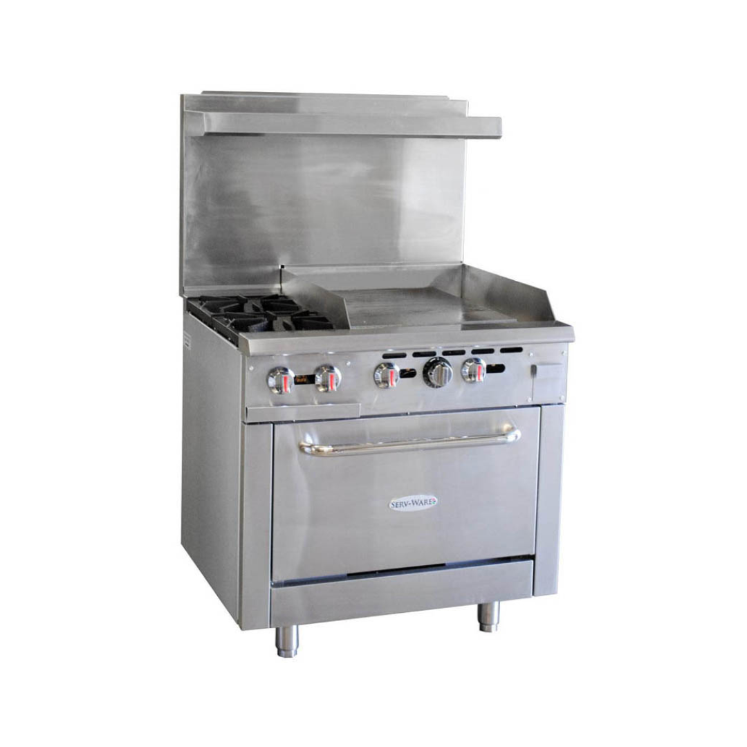 The Serv-Ware SGR-2B-24G Gas Restaurant Range is a powerful and versatile cooking solution, engineered for demanding commercial kitchens. This 36-inch natural gas range features two high-performance 30,000 BTU open burners, a 24" griddle with 20,000 BTU, and a 31,000 BTU standard oven. Whether you're sautéing, grilling, or baking, this unit delivers consistent and efficient heat output for reliable cooking results every time.