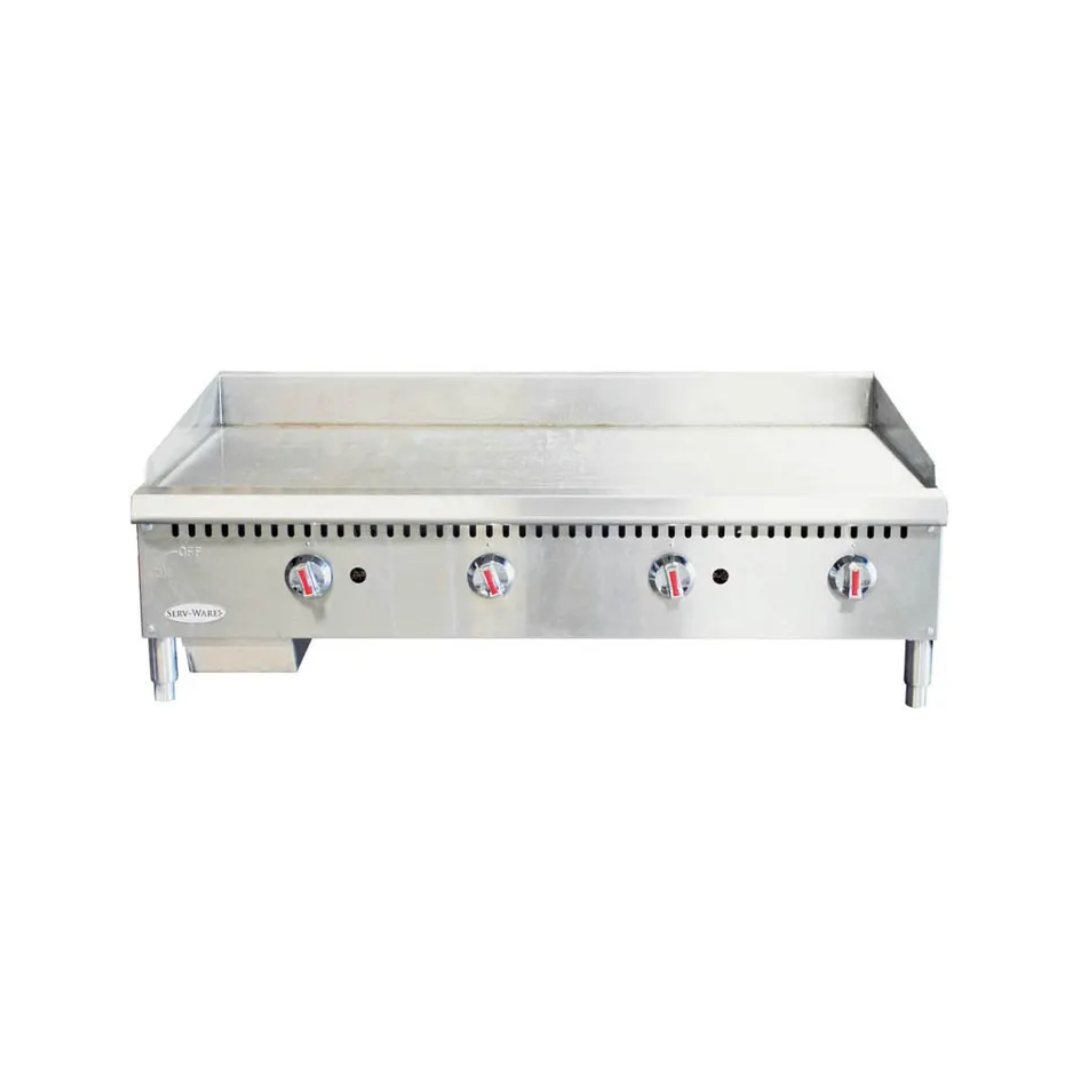The Serv-Ware SMGS-48 Countertop Manual Gas Griddle is a robust and efficient cooking solution for busy commercial kitchens. Featuring a 3/4-inch thick steel griddle plate and powered by four U-shaped stainless steel burners, each delivering 30,000 BTU, this griddle provides even and consistent heat across the entire cooking surface.