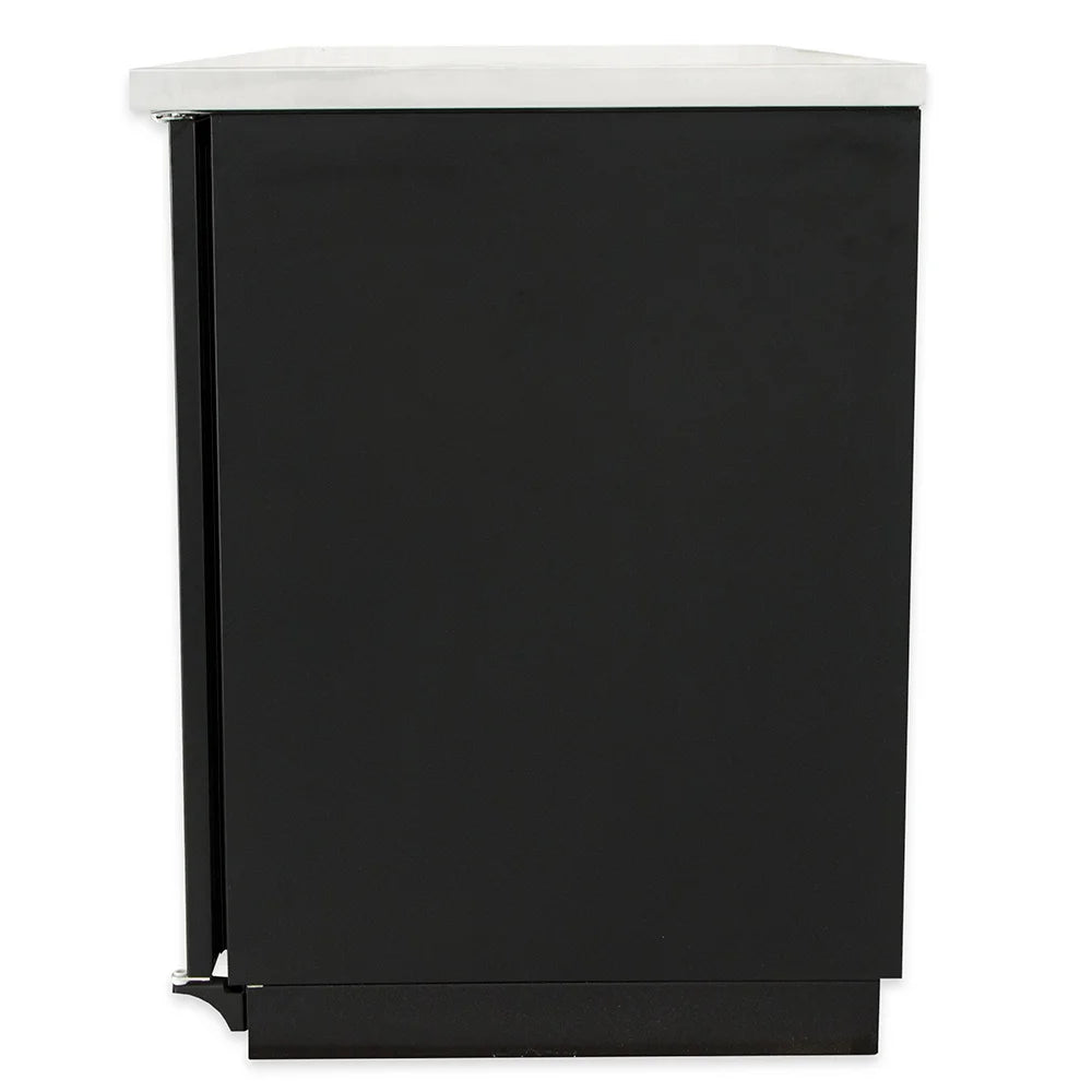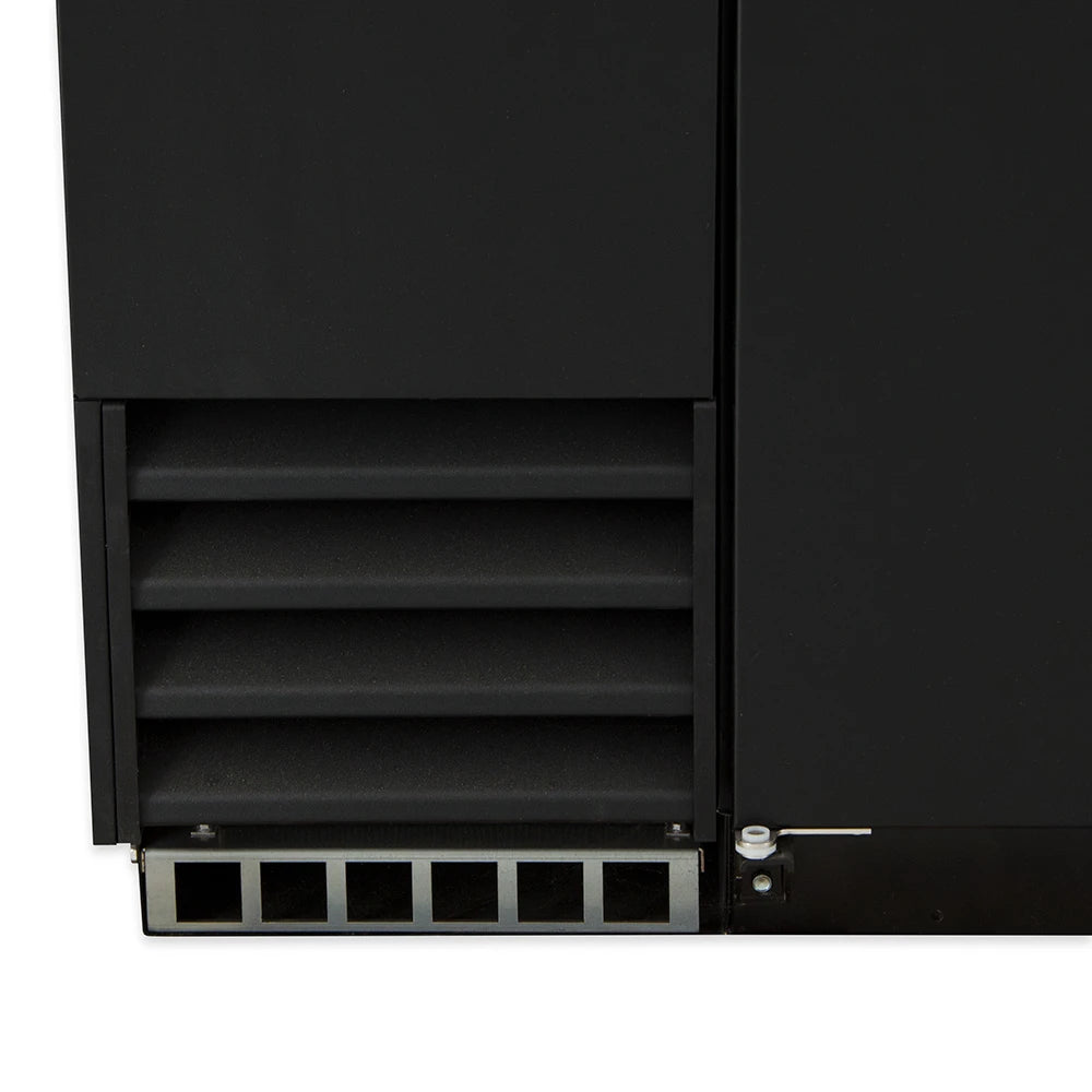 Built for durability, the laminated black vinyl exterior resists stains and scratches, while the stainless steel countertop handles daily wear and prep use. The interior floor includes a ½-inch reinforced lip and a threshold protector to reduce cabinet damage from heavy keg loading. The doors feature 12-inch recessed handles, magnetic gaskets, and factory-installed locks for security and insulation.