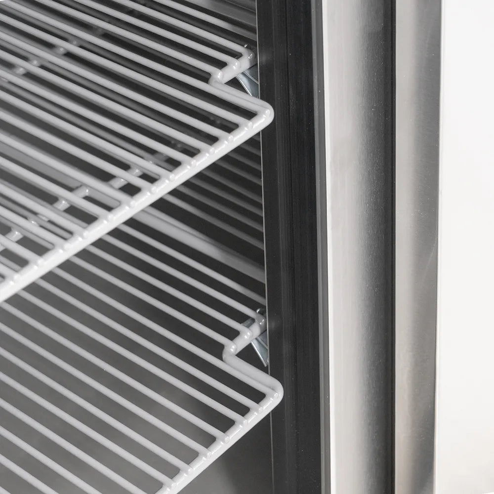 This model features two solid doors that swing within the cabinet's footprint and include 12-inch recessed handles, foamed-in-place for a permanent, sturdy grip. The magnetic door gaskets are removable without tools for easy cleaning, and the interior houses four PVC-coated adjustable shelves to store bulky items like sauce jars or bottled toppings.